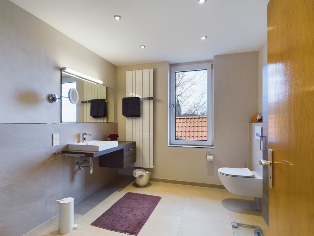 Der großzügige Flur im ersten Obergeschoss verbindet die verschiedenen Wohnbereiche harmonisch und sorgt für eine offene Atmosphäre. Der Dachboden bietet zusätzlichen Stauraum oder kann als Ausbaureserve genutzt werden.
