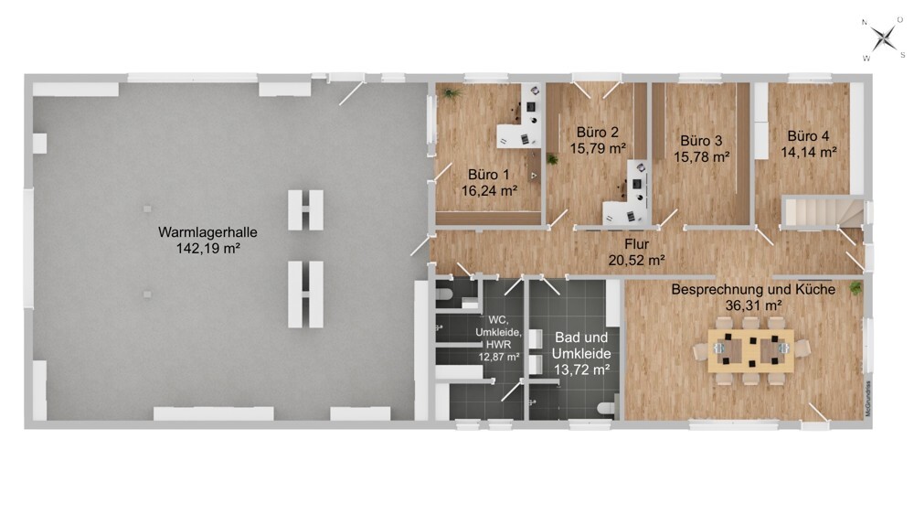 Ergänzt wird das Haupthaus durch eine moderne Warmlagerhalle mit ca. 145 m², die eine Deckenhöhe von 5,75 m aufweist – ideal, um sogar eine zweite Ebene zu realisieren. Ein elektrisch betriebenes Rolltor mit integrierter Lichtleiste ermöglicht einen sicheren und komfortablen Zugang und ein separates WC erfüllt die Bedürfnisse der Mitarbeitenden oder Angestellten.