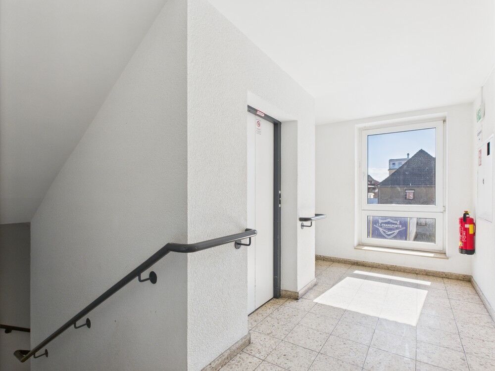 Das Treppenhaus ist hell und einladend gestaltet, was den Zugang zur Praxis erleichtert. Ein Personenaufzug ist vorhanden um einen barrierearmen Zugang in die Praxis zu erhalten.