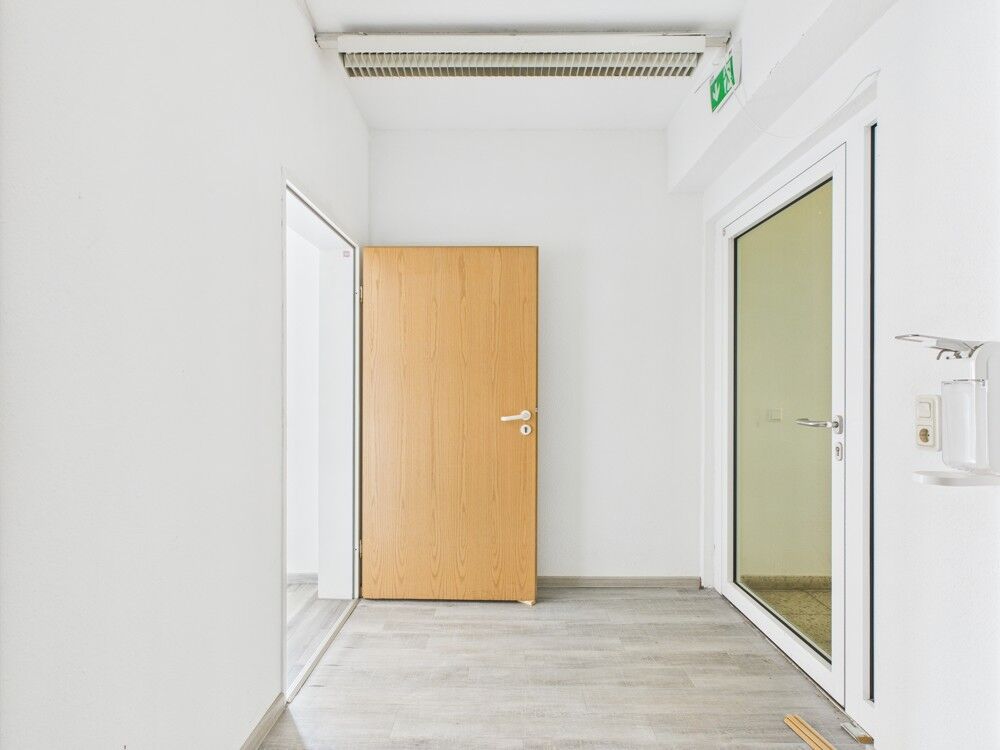 Die Büroflächen sind hell und freundlich gestaltet, mit großen Fenstern, die für viel Tageslicht sorgen. Der Bodenbelag ist modern und pflegeleicht, was zur professionellen Atmosphäre beiträgt.
