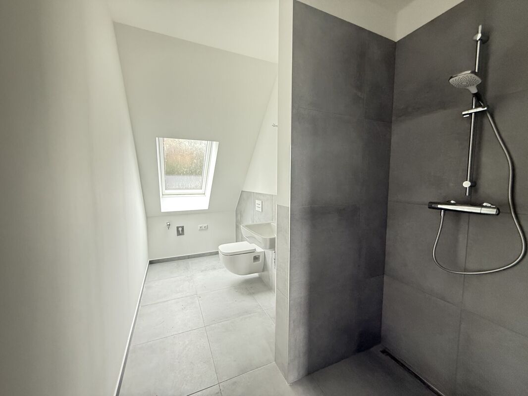 Bad großformatige Fliesen Wand und Fußboden grau
