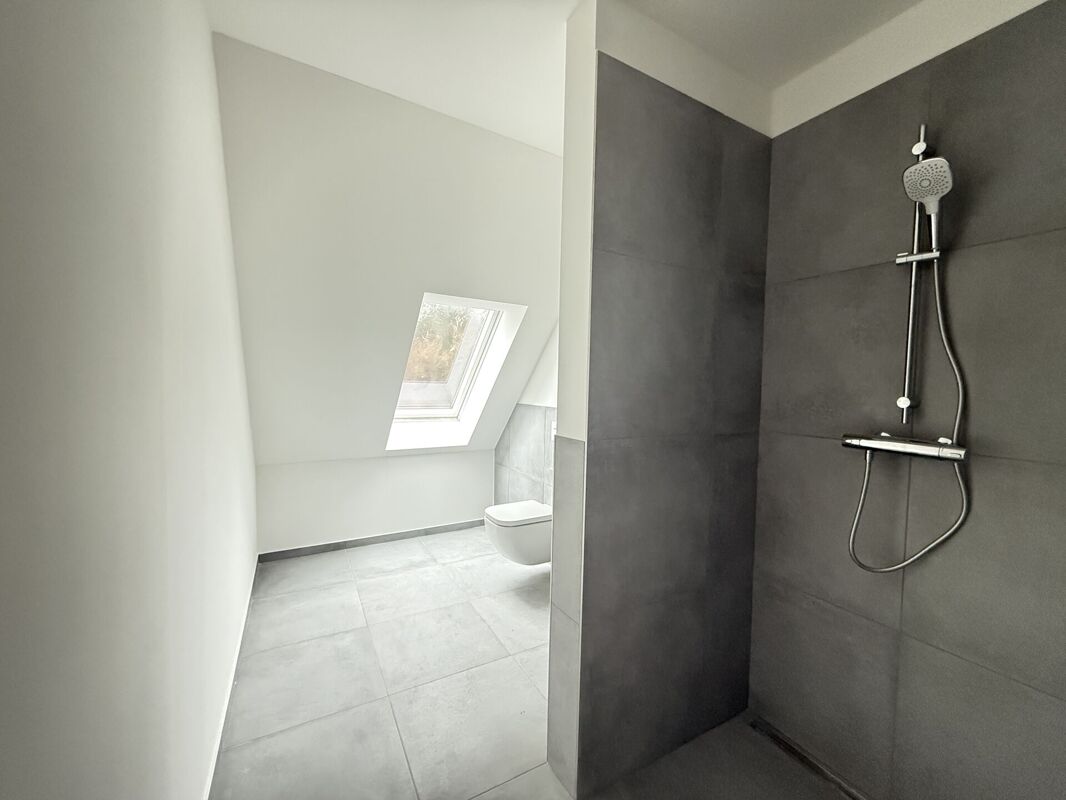 Bad großformatige Fliesen Wand und Fußboden grau